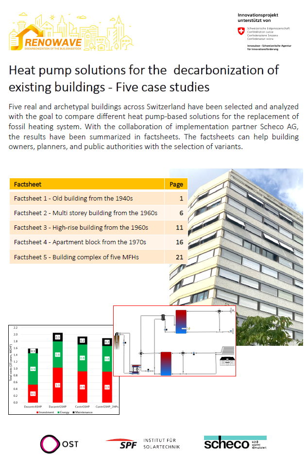 Five real and archetypal buildings across Switzerland have been selected and analyzed with the goal to compare different heat pump-based solutions for the replacement of fossil heating system. With the collaboration of implementation partner Scheco AG, the results have been summarized in factsheets. The factsheets can help building owners, planners, and public authorities with the selection of variants.